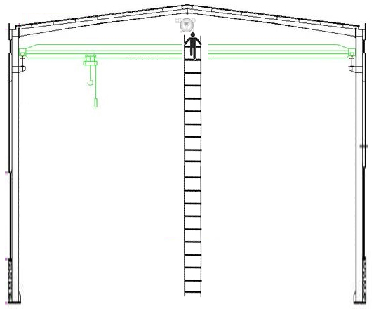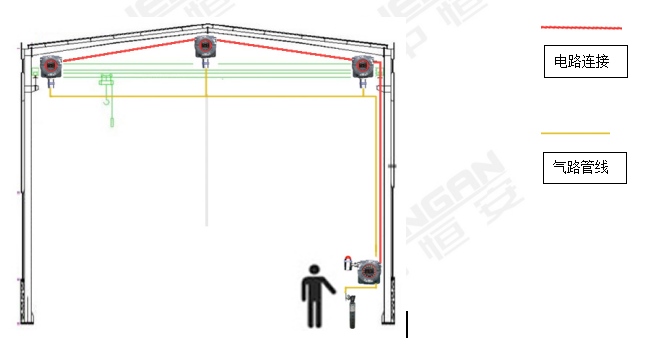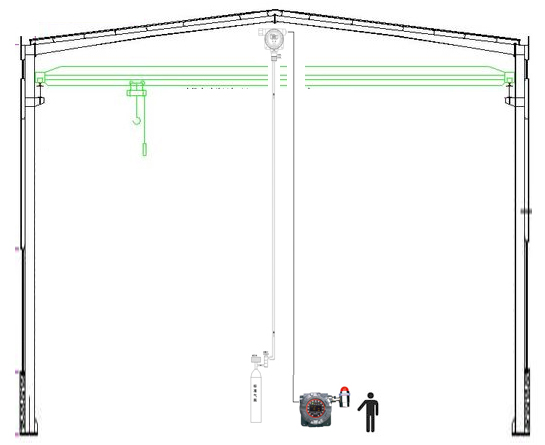 針對(duì)輕于空氣的可燃有毒氣體的檢測(cè),一般會(huì)在廠(chǎng)房最高處易于聚集氣體的位置安裝氣體檢測(cè)器。氣體檢測(cè)器需要定期做校準(zhǔn)和維護(hù),此時(shí)就涉及到如何維護(hù)的問(wèn)題,傳統(tǒng)的做法是維護(hù)人員攜帶工具及標(biāo)準(zhǔn)氣瓶爬梯子上到高處予以維護(hù),危險(xiǎn)性大,可操作性差。具體做法如下圖所示。