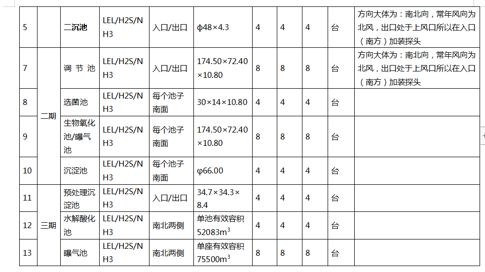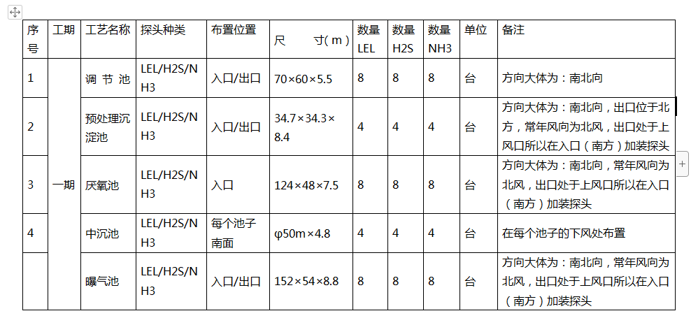 1.1.2 根據(jù)污水處理廠的常用監(jiān)控氣體種類為:可燃氣、H2S和NH3,建議設(shè)置VOC檢測器,以檢測有機揮發(fā)物。因此在每個監(jiān)控點上均布置相同的可燃氣、H2S和NH3 探頭。