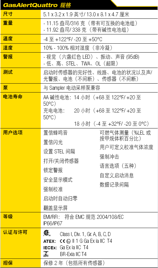 GasAlertQuattro 四種氣體檢測(cè)器具有一鍵式簡(jiǎn)易操作等諸多功能,堅(jiān)固耐用且運(yùn)行可靠。GasAlertQuattro 采用靈活的供電方式,可隨時(shí)使用。液晶圖形屏幕顯示易于識(shí)別的指示操作信息的圖標(biāo),如:沖擊測(cè)試和校準(zhǔn)狀態(tài),便于現(xiàn)場(chǎng)審核。IntelliFlash 不斷以視覺(jué)方式確認(rèn)檢測(cè)器正確運(yùn)行與合規(guī)。GasAlertQuattro 適用于多種工業(yè)應(yīng)用,如:受限空間入口,并可與 BW 公司的 MicroDock II 自動(dòng)測(cè)試和校準(zhǔn)系統(tǒng)完全兼容。