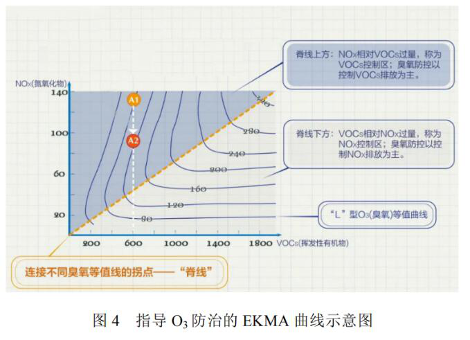 O3生成不僅與前體物VOCs、NOx排放量有關(guān),同時(shí)與兩者的比例密切相關(guān),呈現(xiàn)復(fù)雜的非線性響應(yīng)關(guān)系。經(jīng)典的EKMA曲線可用于揭示VOCs和NOx生成O3的復(fù)雜關(guān)系[3](見圖4),在VOCs和NOx為坐標(biāo)軸的圖上,O3等值曲線是一條條近似等高線的“L”型曲線,連接不同O3等值線的拐點(diǎn)可以形成一條“脊線”,在脊線上方,NOx相對VOCs過量,稱為VOCs控制區(qū)—O3防控以控制VOCs排放為主;在脊線下方,VOCs相對NOx過量,稱為NOx控制區(qū)—O3防控以控制NOx為主。在VOCs控制區(qū),VOCs排放保持不變,減排NOx,O3濃度有可能上升。相關(guān)研究表明,我國O3污染重點(diǎn)區(qū)域總體上為VOCs與NOx協(xié)同控制區(qū),但多數(shù)市區(qū)為VOCs控制區(qū),主要受烯烴、芳香烴和醛類的控制。因此,“十四五”期間O3控制應(yīng)強(qiáng)調(diào)VOCs和NOx協(xié)同減排,特別是應(yīng)加大VOCs的減排力度。