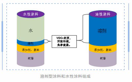 水性涂料用水作為分散介質(zhì),即用水來調(diào)漆,在噴涂和干燥過程中揮發(fā)的是水,VOCs排放極少。溶劑型涂料用有機溶劑(VOCs含量100%的稀釋劑)來調(diào)漆,在噴涂和干燥過程中有大量的VOCs揮發(fā)。