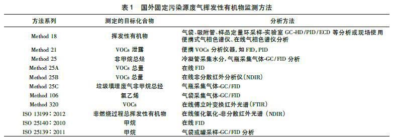 美國(guó)環(huán)保署推出的VOCs監(jiān)測(cè)方法有環(huán)境空氣VOCs分析方法、室內(nèi)空氣VOCs分析方法和固定源廢氣VOCs分析方法。固定污染源廢氣多采用在線分析儀進(jìn)行現(xiàn)場(chǎng)分析,如在線GC-MS /FID/PID/ECD 等,還可使用傅立葉變換紅外光譜和非分散紅外分析儀,還可將廢氣采集于氣袋或氣瓶中后再進(jìn)行分析。國(guó)際標(biāo)準(zhǔn)化組織( ISO) 也發(fā)布了關(guān)于VOCs檢測(cè)的標(biāo)準(zhǔn)方法,對(duì)于固定源廢氣主要采用在線方法,如催化氧化-非分散紅外光譜、GC/FID 等。具體監(jiān)測(cè)方法見(jiàn)表1。