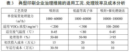 印刷企業(yè)典型治理措施的適用工況、處理效率及成本分析見表3。