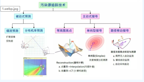 VOCs臭氣污染溯源技術(shù)是污染物濃度監(jiān)測結(jié)果的綜合應(yīng)用,其原理是利用點(diǎn)監(jiān)測或線監(jiān)測設(shè)備的監(jiān)測結(jié)果,結(jié)合風(fēng)向數(shù)據(jù),計(jì)算污染物在空間中的機(jī)率分布,或利用適當(dāng)?shù)穆肪€規(guī)劃,移動(dòng)量測位置以達(dá)到標(biāo)定污染源位置的目的。綜合國內(nèi)外的技術(shù)發(fā)展現(xiàn)狀,污染溯源技術(shù)可大概分為被動(dòng)式及主動(dòng)式兩種(如下圖)。主動(dòng)式搜尋方法較常見的有等高圖高點(diǎn)、單純型搜尋和路徑移動(dòng)搜尋。被動(dòng)式預(yù)測方法則包含煙流預(yù)測和分布幾率預(yù)測等方法。