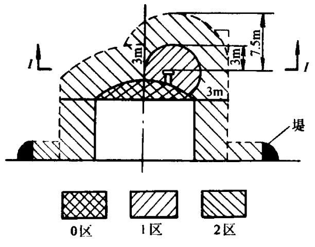 圖中所示,對(duì)于露天油罐而言,0區(qū)一般存在于油罐的上方,1區(qū)一般存在于油罐呼吸閥的周邊,而其他周邊位置一般為2區(qū)。